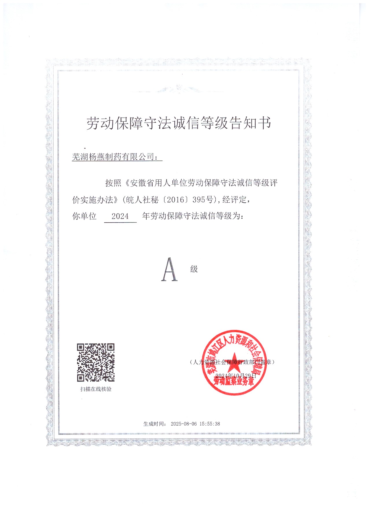 公司重視藥品質(zhì)量體系及人才隊伍建設,連續(xù)4年被原蕪湖市食品藥品監(jiān)督管理局表彰為“安全誠信示范單位”;連續(xù)8年被評為用人“A”級(最高級)勞動保障誠信用人單位;連續(xù)5年納稅信用等級被評為A級;2020年當選蕪湖市藥學會書記兼秘書長單位;2021年被授予蕪湖市“三八紅旗集體”榮譽稱號;2022年當選鳩江區(qū)工商聯(lián)副主席單位,并被評為優(yōu)秀會員企業(yè)。